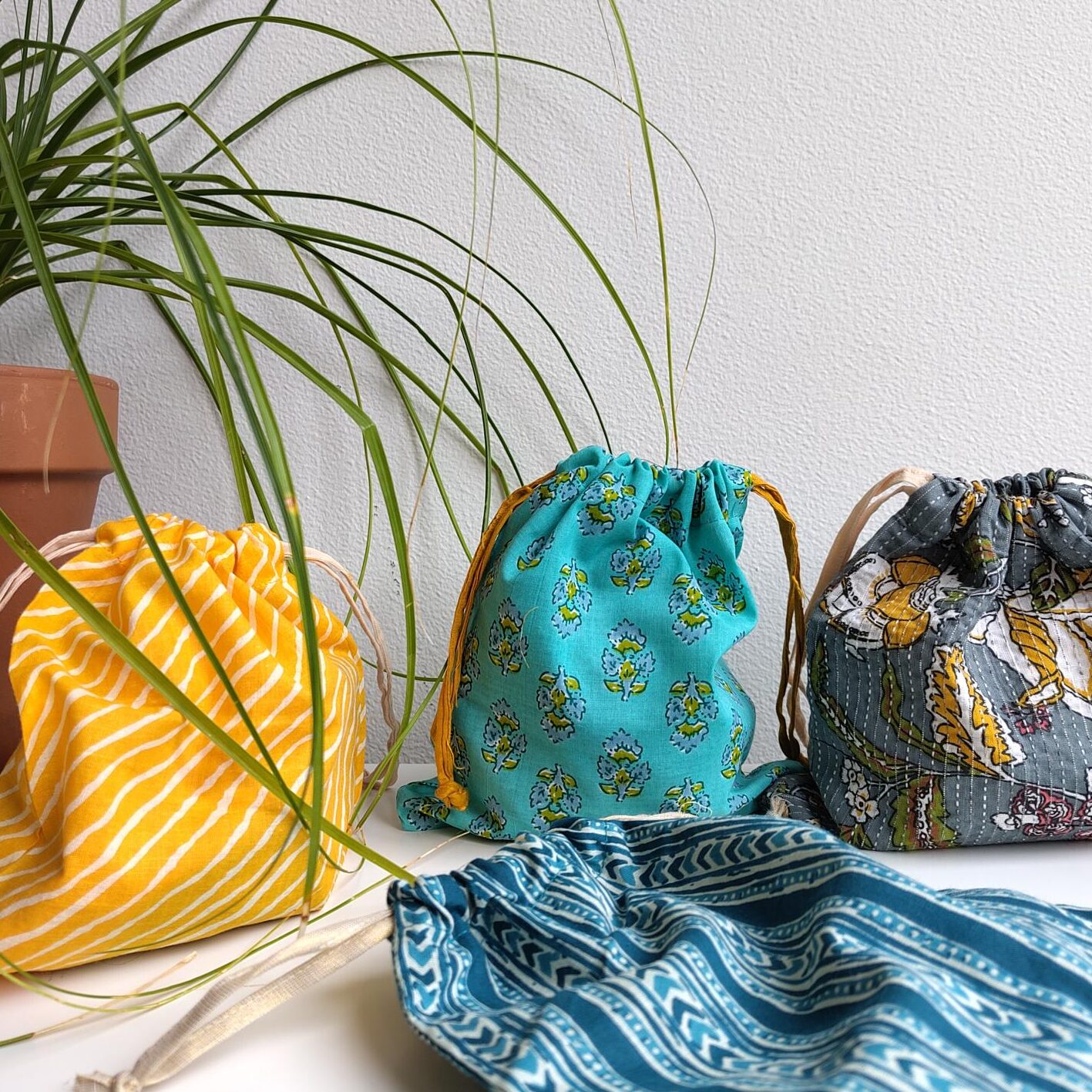 Kleine Beutel aus indischen Blockprintstoffen. Hergestellt im Textilverarbeitungszentrum unserer Partnerorganisation in Hyderabad.